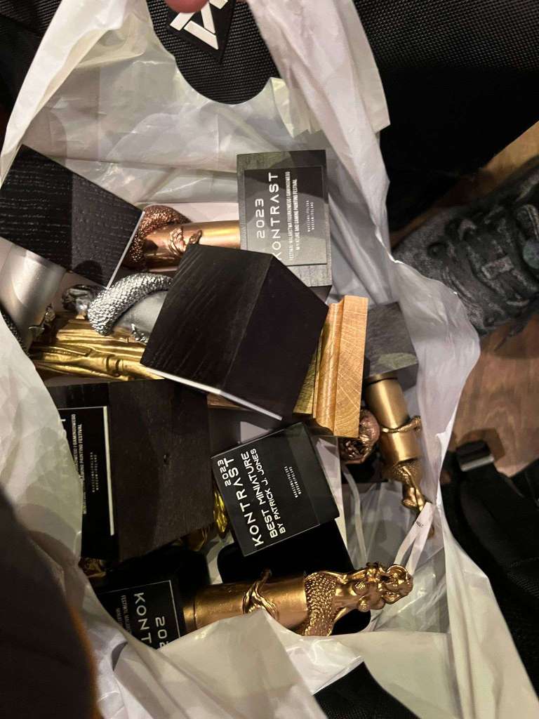 The infamous plastic bag of trophies. I felt horrible about carrying them like this but with 13 entries all of my storage was already in use! Luckily nothing broke, just one trophy detached from the plinth.The final haul at the hotel the following morning. One masters gold, two masters silvers, four masters bronzes, one gaming silver and three special awards. Check the gallery of my entries in the end if you’re interested in seeing what earned what.